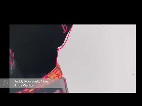 Andy Warhol Teddy Roosevelt (1986) is a portrayal of a young Teddy Roosevelt wearing military uniform. His face is dark and reveals relatively little detail; his facial features are only delineated by pink contours that vaguely define his eyes, glasses, nose, mouth, and mustache. His uniform is also dark, creating the sense that he is more of a silhouette than a man.