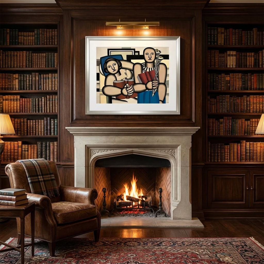 Fernand Léger lithograph La Lecture (The Reader), c. 1953; Two geometric female figures gaze out at the viewer, books in hand. The figure on the left lounges, grasping an open book, yet does not look down to read but rather stares out towards the viewer. The more symmetrical, bald figure on the right stands at a harsh vertical with her book to her chest. This "bald" female subject was the source of much criticism for Léger, yet he refused to place hair upon her head.