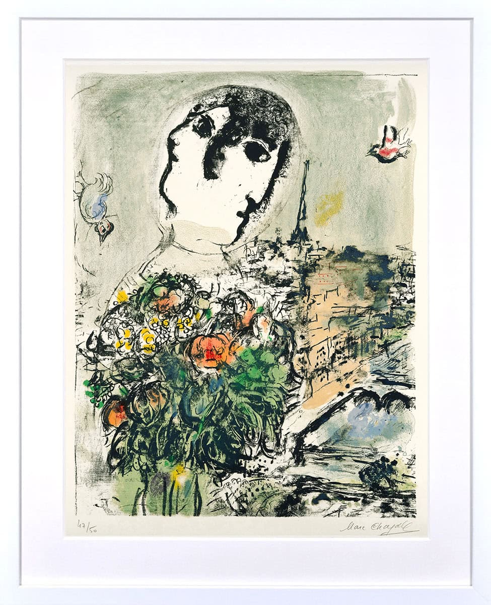 Depicting a double faced portrait of two people combined into one, the viewer gains visual access to the artist's inner most thoughts. Possibly a portrait of Chagall and his wife, the two faces hover over an energetic and lively scene of Paris, with the Eiffel Tour visible in the distant horizon. A large bright bouquet of flowers emerges at the bottom of the image, as though offering us their beauty. Layered washes of bright blues, vivid greens, vibrant reds and pale peaches, give this work a dazzling appearance and capture the viewer's attention. Symbols found throughout Chagall's oeuvre appear at the edge of the image, a blue bird sits on the left and a red bird on the right. This work illustrates the artist's perpetual believe in the harmonious coexistence between man and nature.