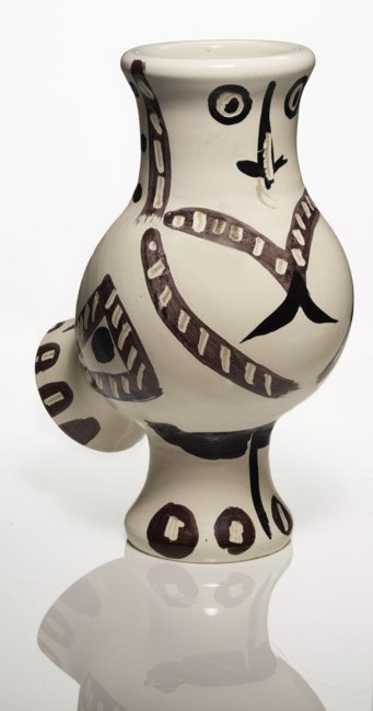 An owl with dotted feathers appears as if standing before us. With whimsical, oxide decoration, Picasso incorporates traditional features of a vase and pitcher to create an owl's abstracted form. This is a truly stunning work best admired and appreciated in person, as one can experience its full, three-dimensional effect by observing its features from all sides.