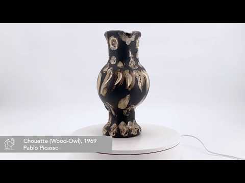 A lively rendition of an owl, Pablo Picasso ceramic Chouette (Wood-Owl), 1969 A.R 605 is a beautiful bird. Careful use of engraving and engobe decoration create textured feathers that line the rounded body of the bird. The eyes are also engraved, giving them a depth and a look of concentration that intensifies the emotional state of the owl. One aspect that makes Picasso ceramics so special is the link between the physical form of the ceramic and the decorative scheme chosen. In this case, a vase creates the perfect body for an owl. The small foot of the vase becomes the perched feet of the owl, and the circular addition to the back stands in as the tail. The lip of the vase is punctuated by a smooth spout, which marks the beak of the bird. We get the feeling that the owl fully embodies this vase. The beautiful and understated color palate adds more realism to Picasso ceramic Wood-Owl (Chouette), 1969 A.R. 605, and it truly comes to life in front of our eyes.