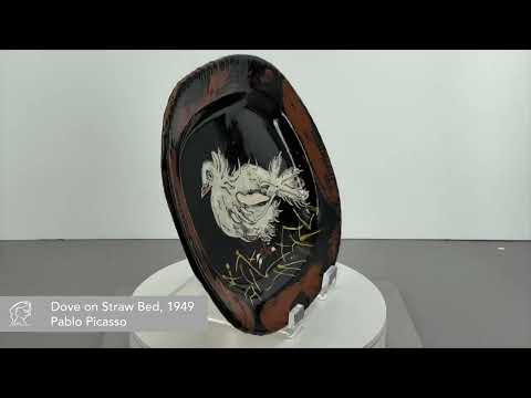 Pablo Picasso Colombe sur lit de paille (Dove on Straw Bed), 1949 depicts an exquisite dove that rests atop a bed of straw. The dove, a universal symbol for peace, is a recurring subject in Picasso's works. In this ceramic, Picasso illustrates a fairly life-like dove, one that lacks the sharp pointed angles of abstraction that his other works sometimes display. In this piece, he pays attention to intricate detail, outlining each tuft and feather in thin, black lines and taking the time to convey expression, best represented through the dove's small, beady eye and delicate beak. The dove is stark white, standing out against the dark black background. The glossy finish of the piece encourages viewer interaction, shimmering to capture the light and drawing the viewer in to this image of peace and beauty.