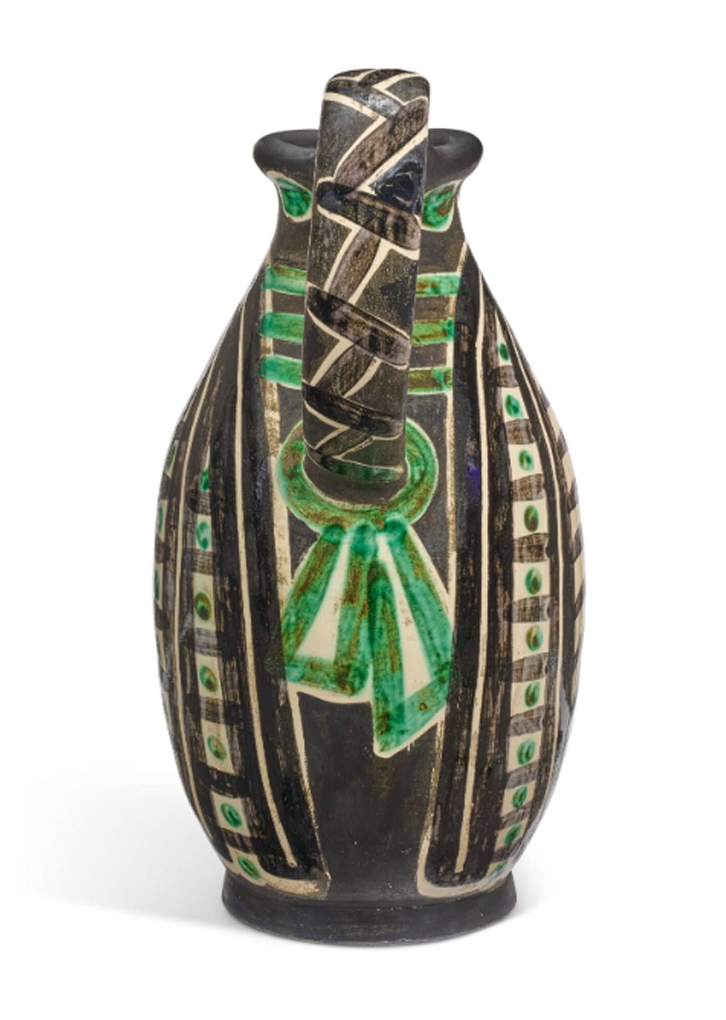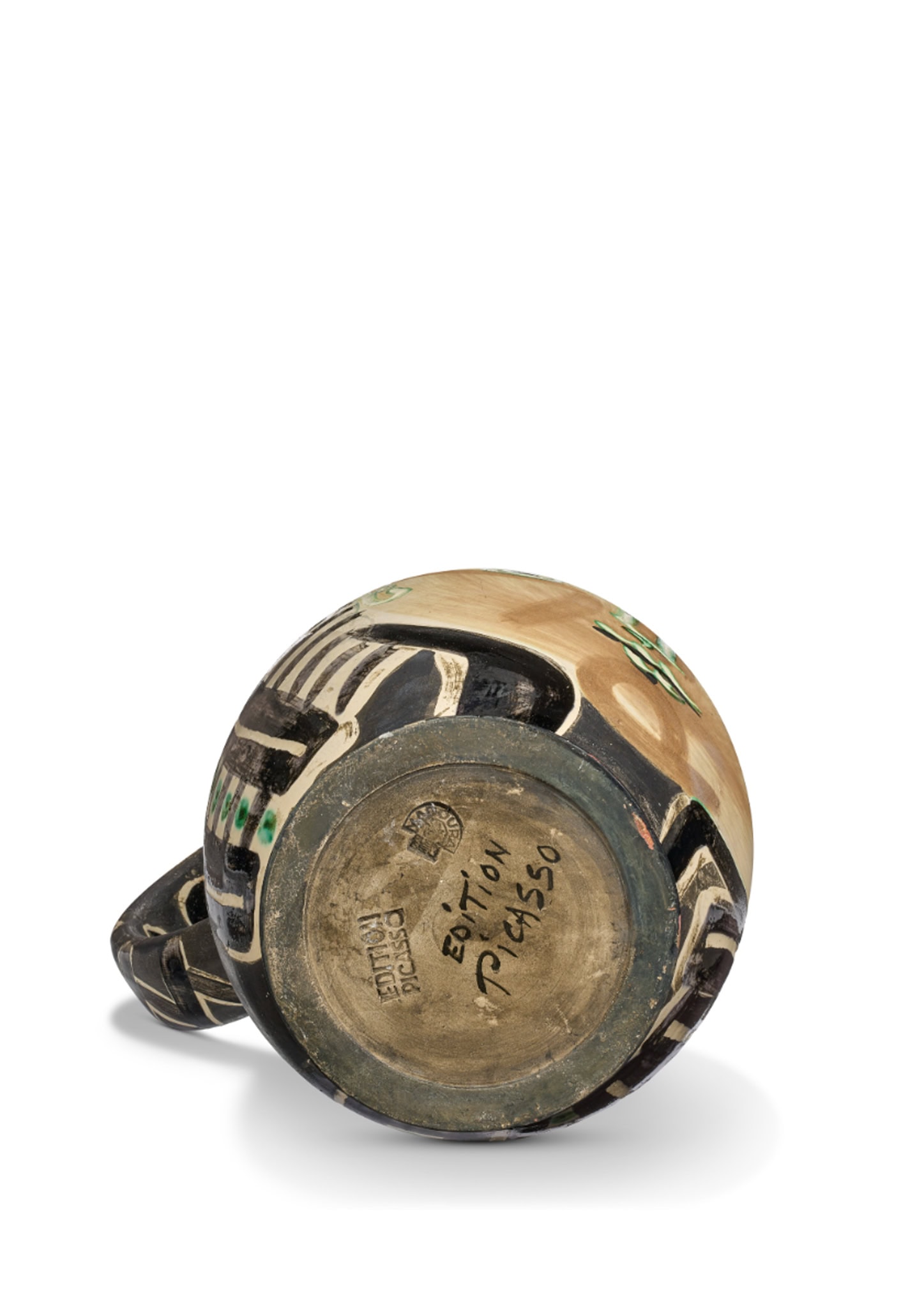Created in 1953, this turned pitcher of white earthenware clay with decoration in engobes, knife engraved under partial brushed glaze (black, beige, green, grey patina) is from the edition of 500. Featured on the verso are the inscribed stamps 'MADOURA PLEIN FEU' and 'EDITION PICASSO', along with the handwritten 'EDITION PICASSO' inscription in black.