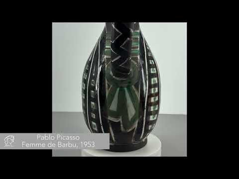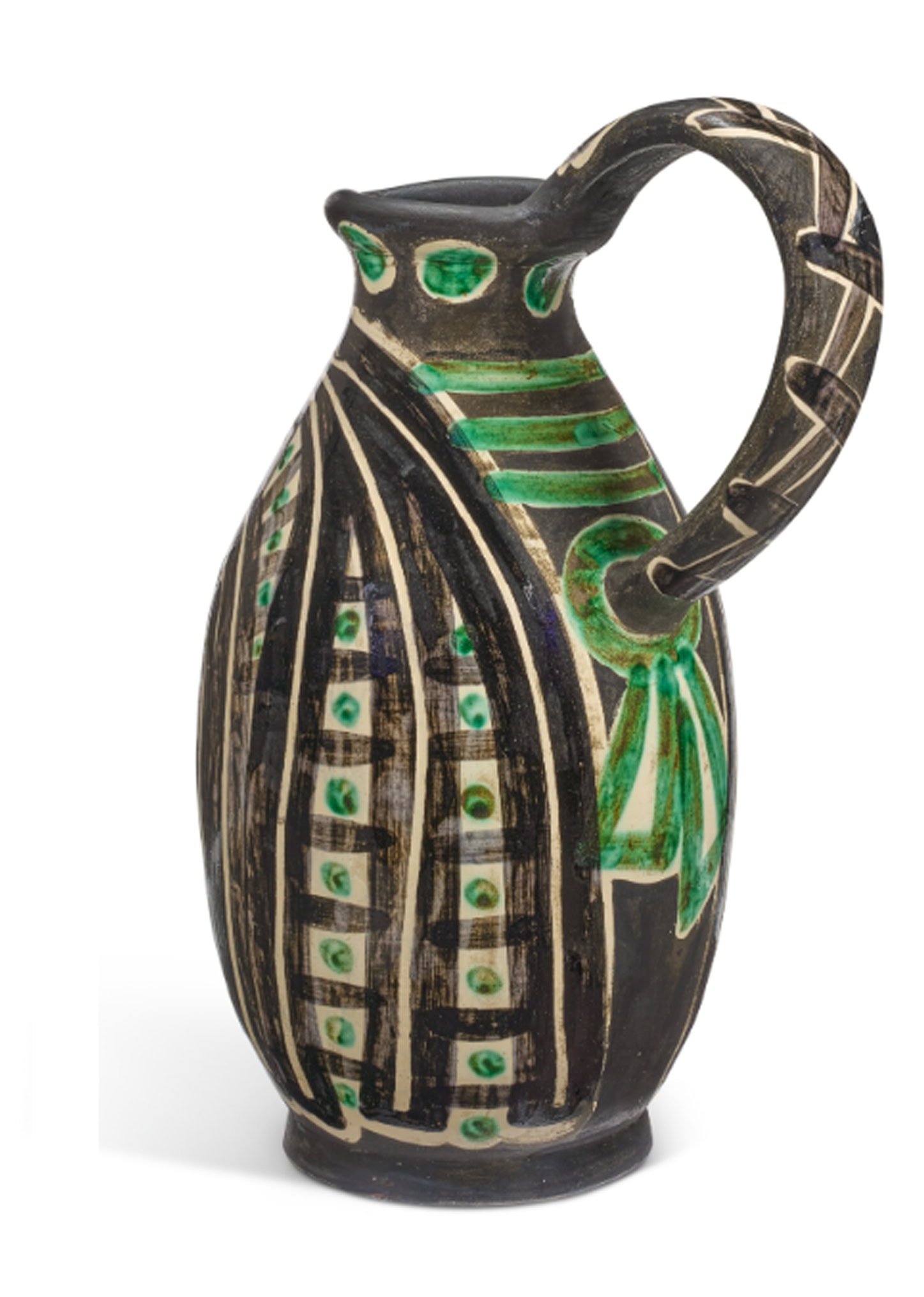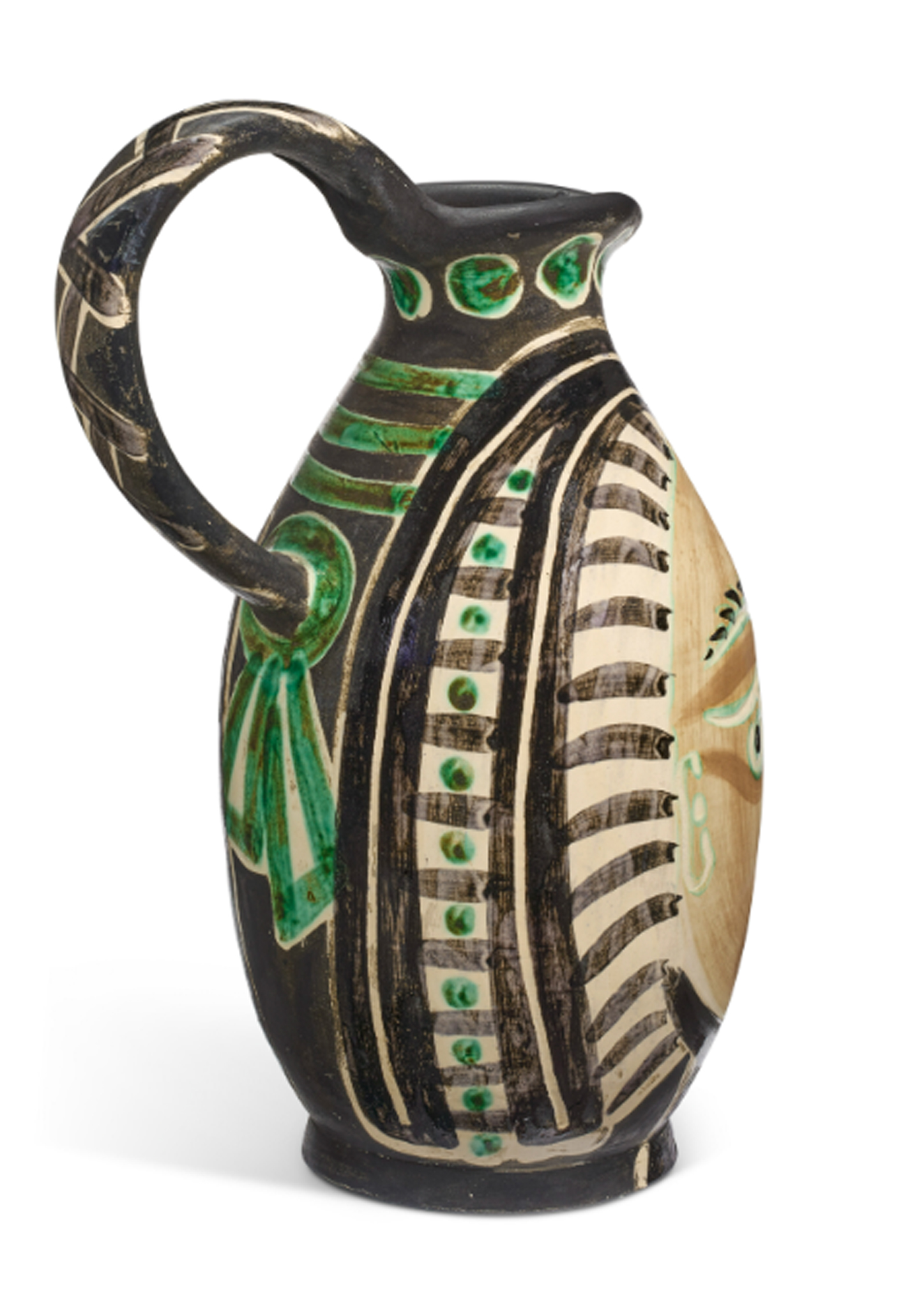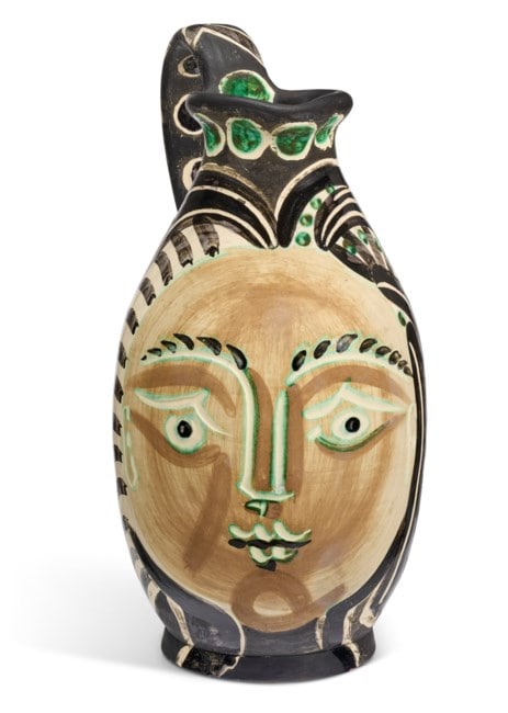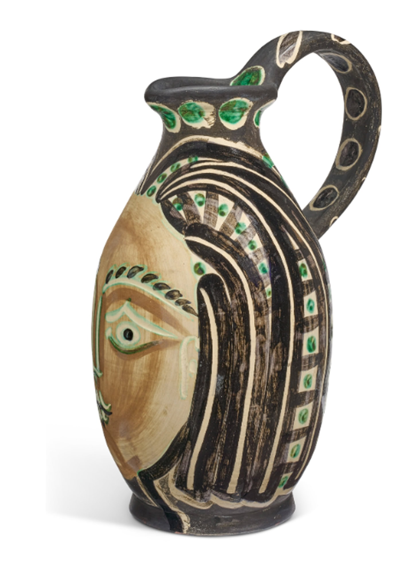 In this charismatic ceramic, Picasso creates a strong profile of a woman. With green and white highlights to accentuate the facial features over the beige underneath, it's almost as if she is effervescent. Taken in contrast to her dark luscious hair that flows around the vase, everything Picasso does accentuates the pitcher's shape perfectly, right down to the neck which is hardly ever featured in his ceramic faces.
