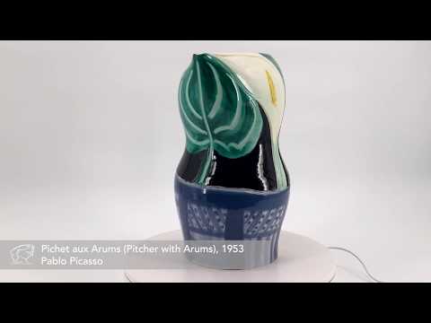 White arum lilies curl up the side of Pablo Picasso Pichet aux arums (Pitcher with Arums), 1953 A.R. 189. The delicate neck of the lily snakes up the body of the ceramic until it opens up into a bloom that joins with the spout of the pitcher. Engraving adds smooth lines to delineate other characteristics of the lily. Verdant green leaves cradle the white flower, and the black background further allows the bloom to stand out. The blue patterning around the pitcher appears as a table cloth and a surface for the lilies to stand on.