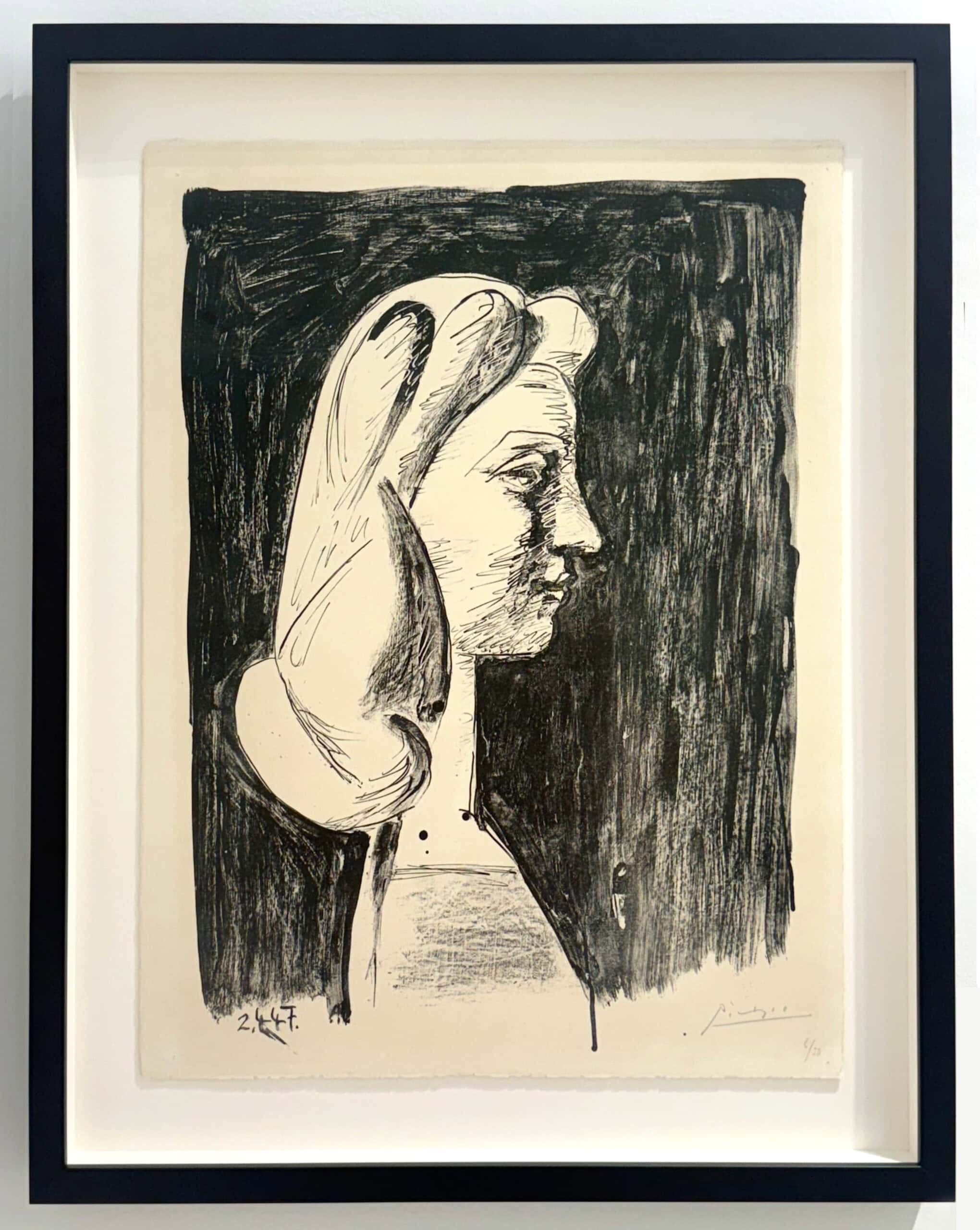 A striking 1947 lithograph by Pablo Picasso, Grand Profil (Large Profile) captures the artist’s bold postwar shift toward simplified forms and powerful sculptural silhouettes. Rendered with sweeping contours and masterful economy of line, this iconic profile reveals Picasso’s genius for transforming the human face into pure rhythm and abstraction. A rare and sought-after work, it embodies the energy, innovation, and timeless modernity that define Picasso’s late 1940s graphic oeuvre. Perfect for collectors seeking an exceptional museum-quality Picasso print.